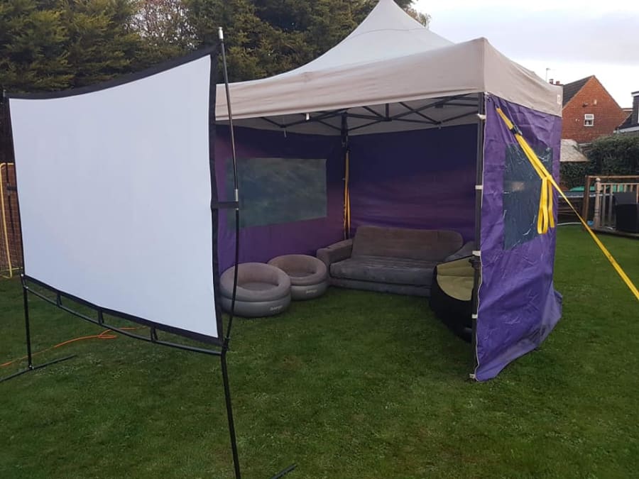 We supply an open or closed gazebo for your parties and events. When the walls are up, not only does it improve the light of our superb projector, but it also enhances the speakers for excellent sound quality! and protects from the elements of good old British weather