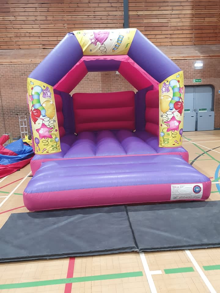 This bouncy castle features a delightful pink and purple color scheme, adorned with balloons, hearts, stars, and streamers in cheerful yellow. It's the perfect way to add a pop of color and excitement to any party or event.