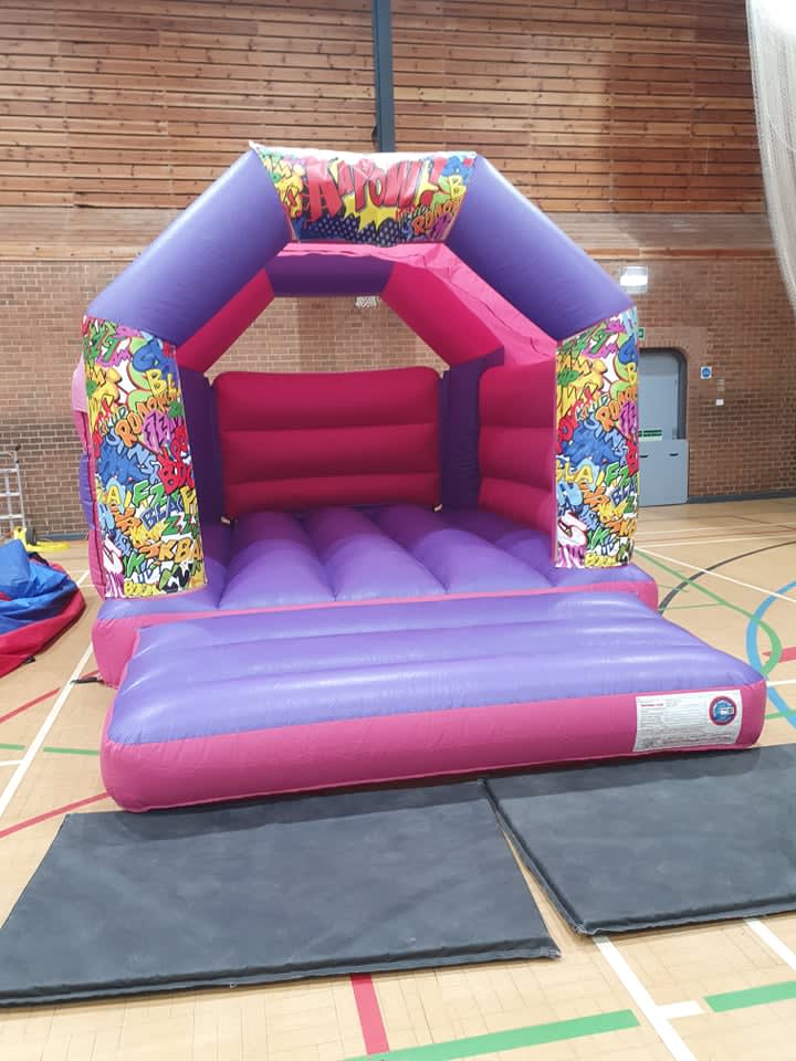 Perfect for comic book enthusiasts, this vibrant and exciting inflatable will bring the world of superheroes to life at your next event. With its eye-catching design featuring bold sound effect graphics and a striking pink and purple color scheme, this bouncy castle is sure to be a hit with kids and adults alike.