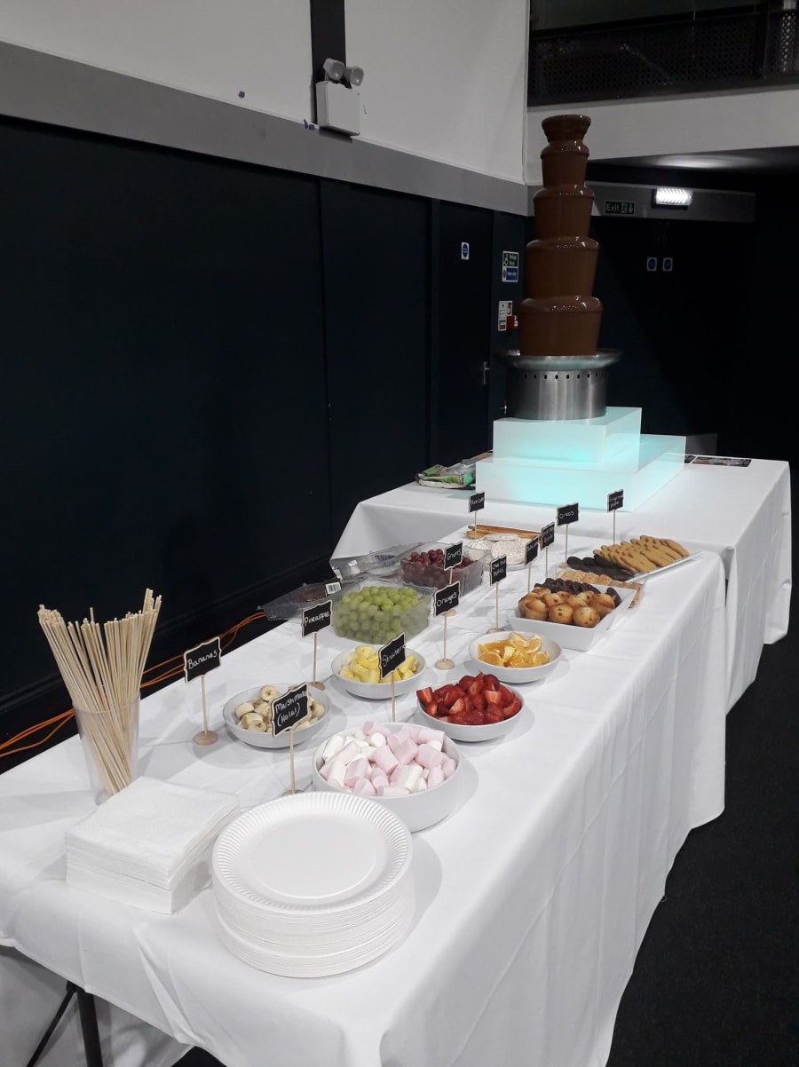 Our Deluxe Chocolate Fountain service includes 10kg of the finest Belgian chocolate, ensuring a rich and velvety flow that will tantalize your taste buds. We take pride in using only the highest quality ingredients, so you can be confident that every dip will be a pure delight. Our chocolate fountain is accompanied by a wide assortment of dipping treats, including fresh fruits, marshmallows, cookies, and more. There is something for everyone to enjoy!
