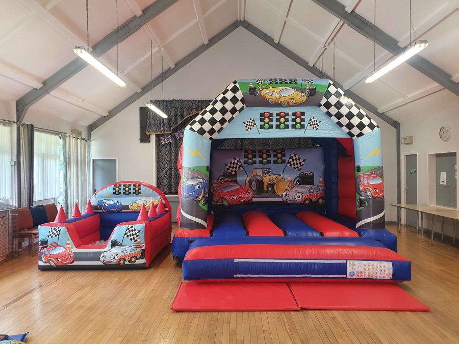 Racing Cars themed party featuring Bouncy Castle, Inflatable Ball Pool & Matching Soft Play.